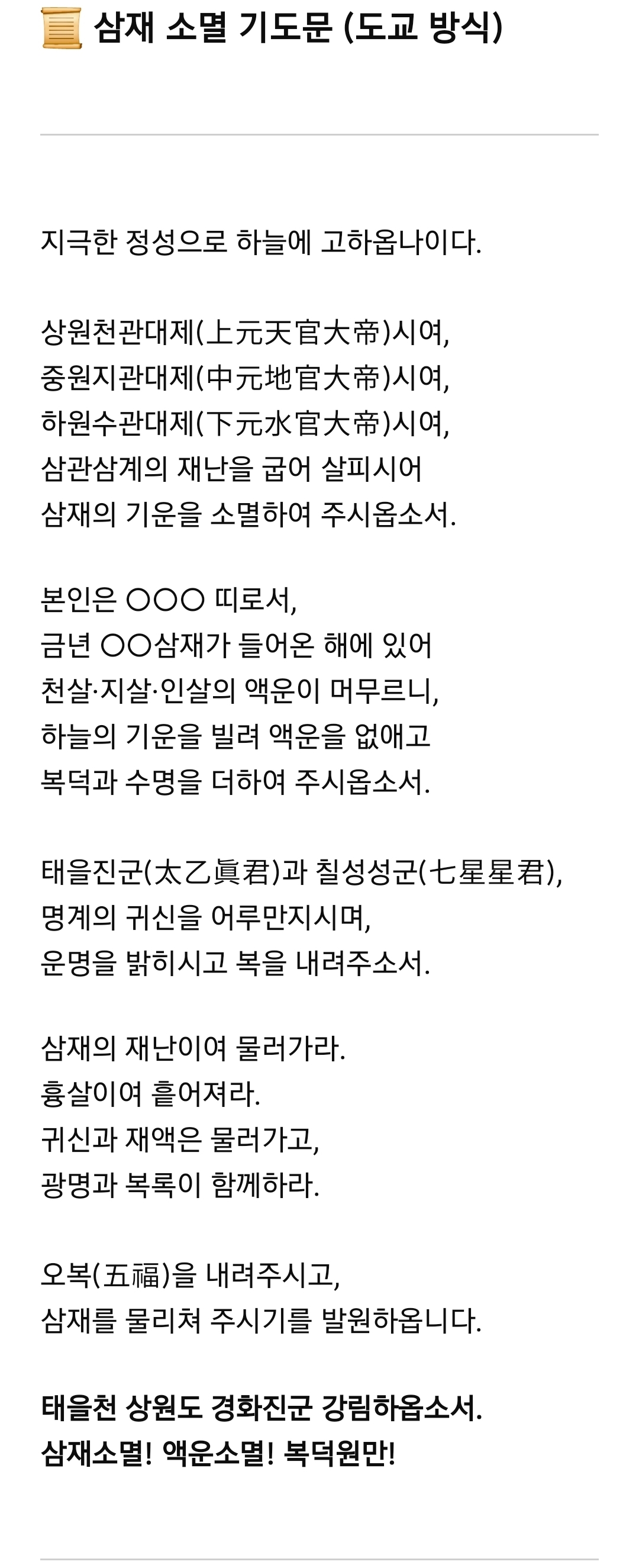 도교식 삼재 해소 기도문은 불교와는 달리, **하늘(天), 별(星), 신장(神將)**에게 기도하며 재앙을 물리치고 복을 부른다는 의미가 강조됩니다. 주로 삼관대제(三官大帝), 태을진군(太乙真人), 칠성신(七星神) 등을 대상으로 기도합니다.