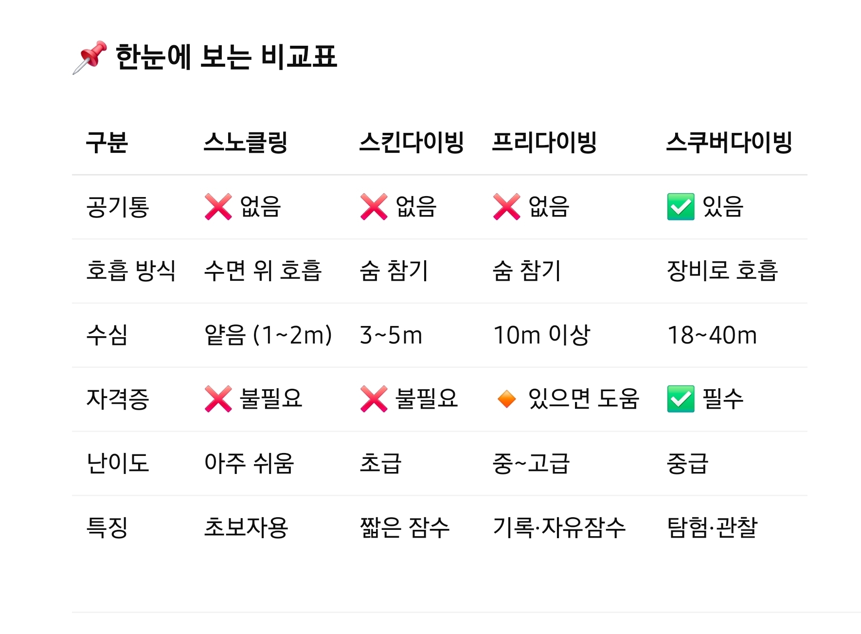 스노클링, 스킨다이빙, 프리다이빙, 스쿠버다이빙 차이점 정리