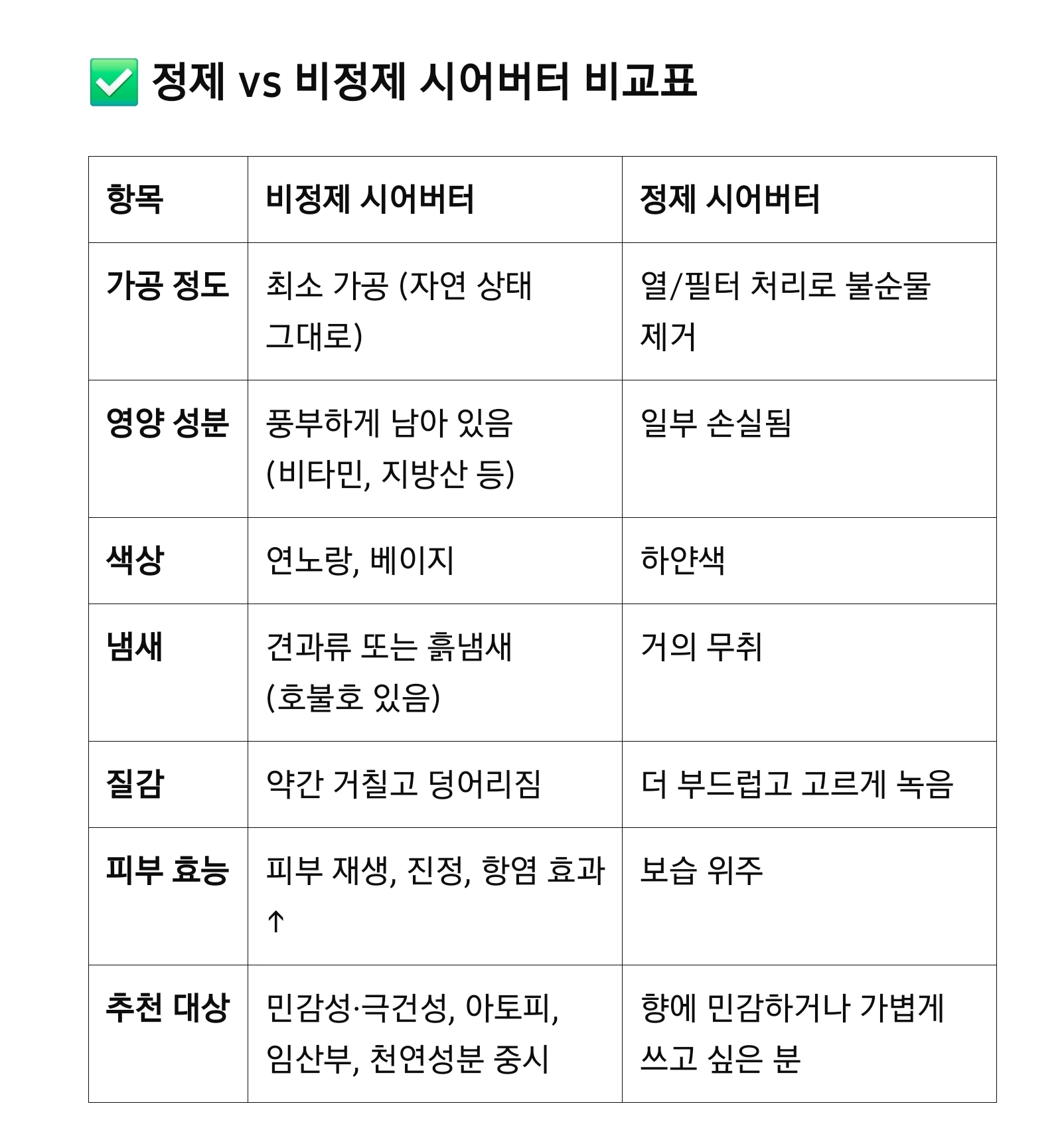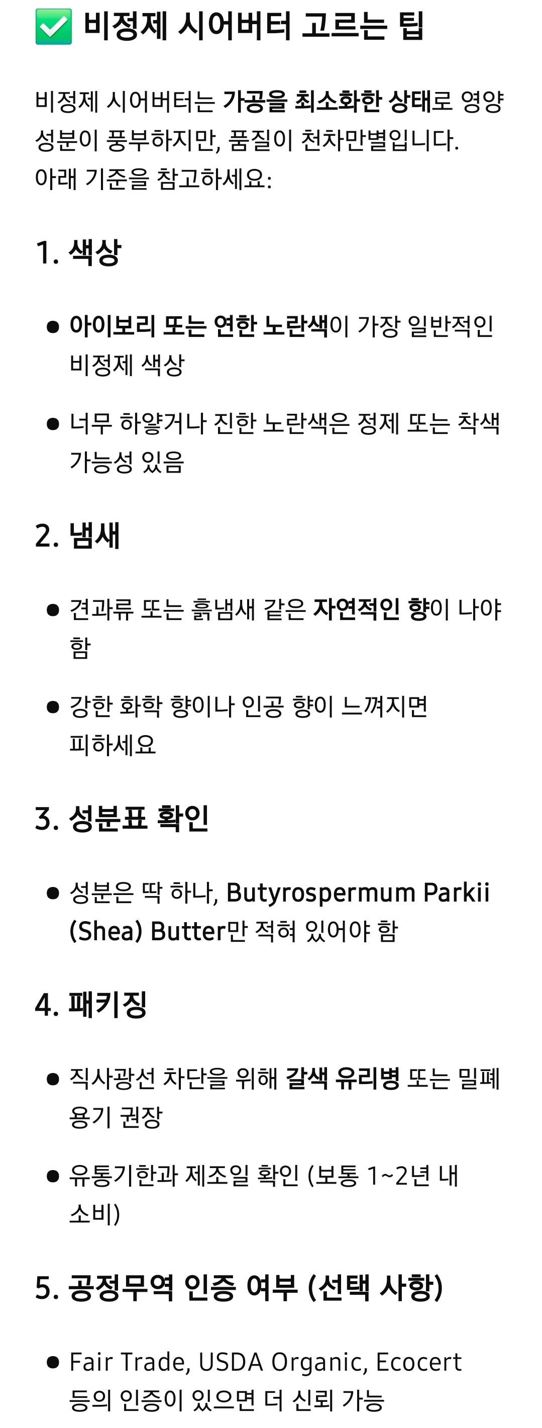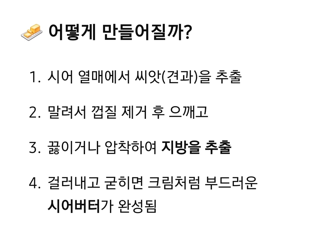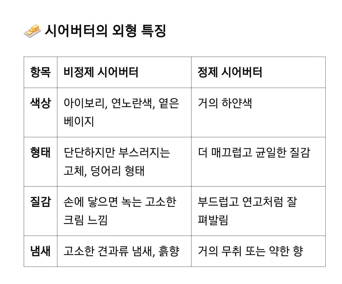 시어버터(Shea Butter)는 서아프리카산 시어 나무(카리테 나무, Vitellaria paradoxa)의 열매에서 추출한 천연 식물성 버터입니다.