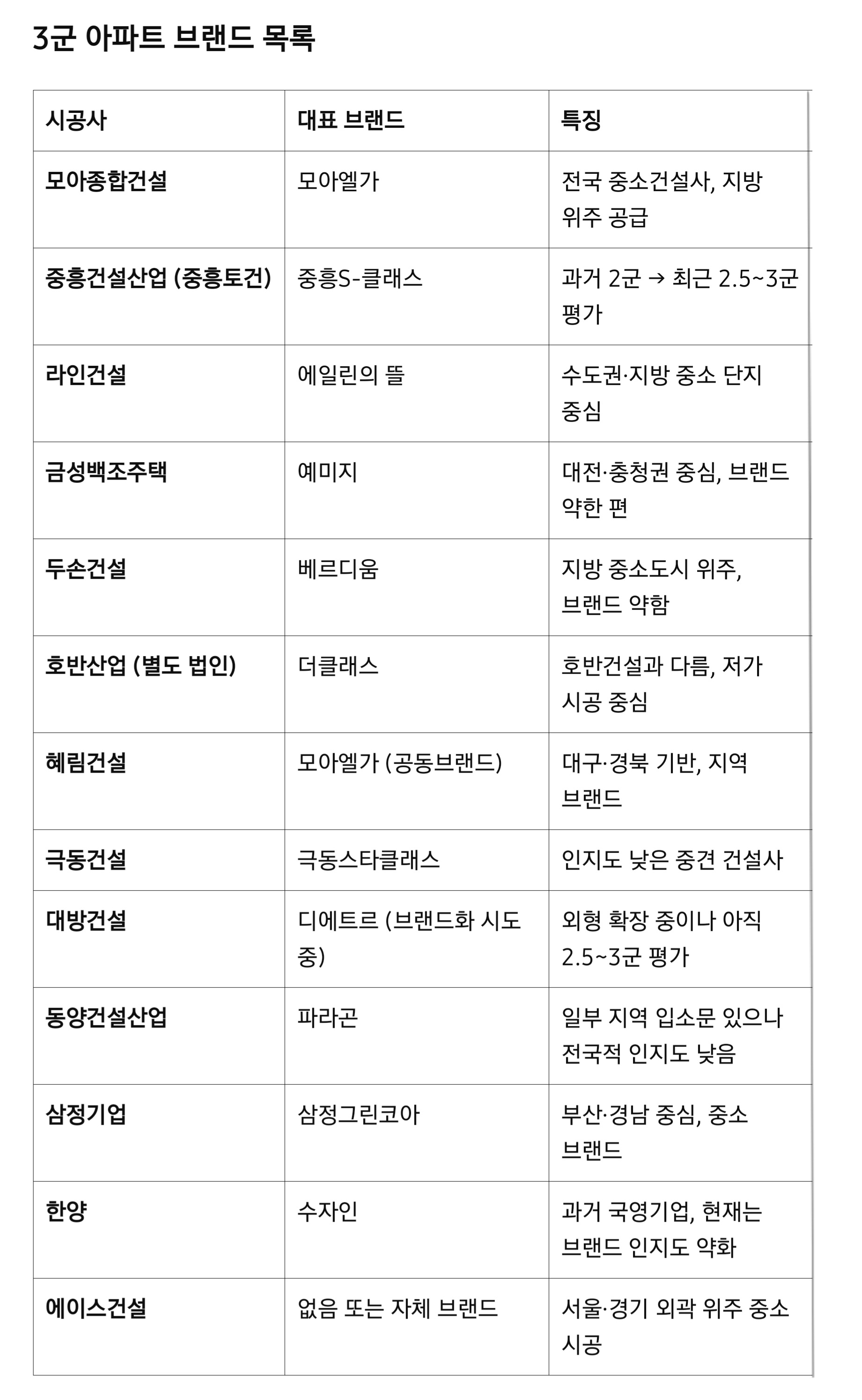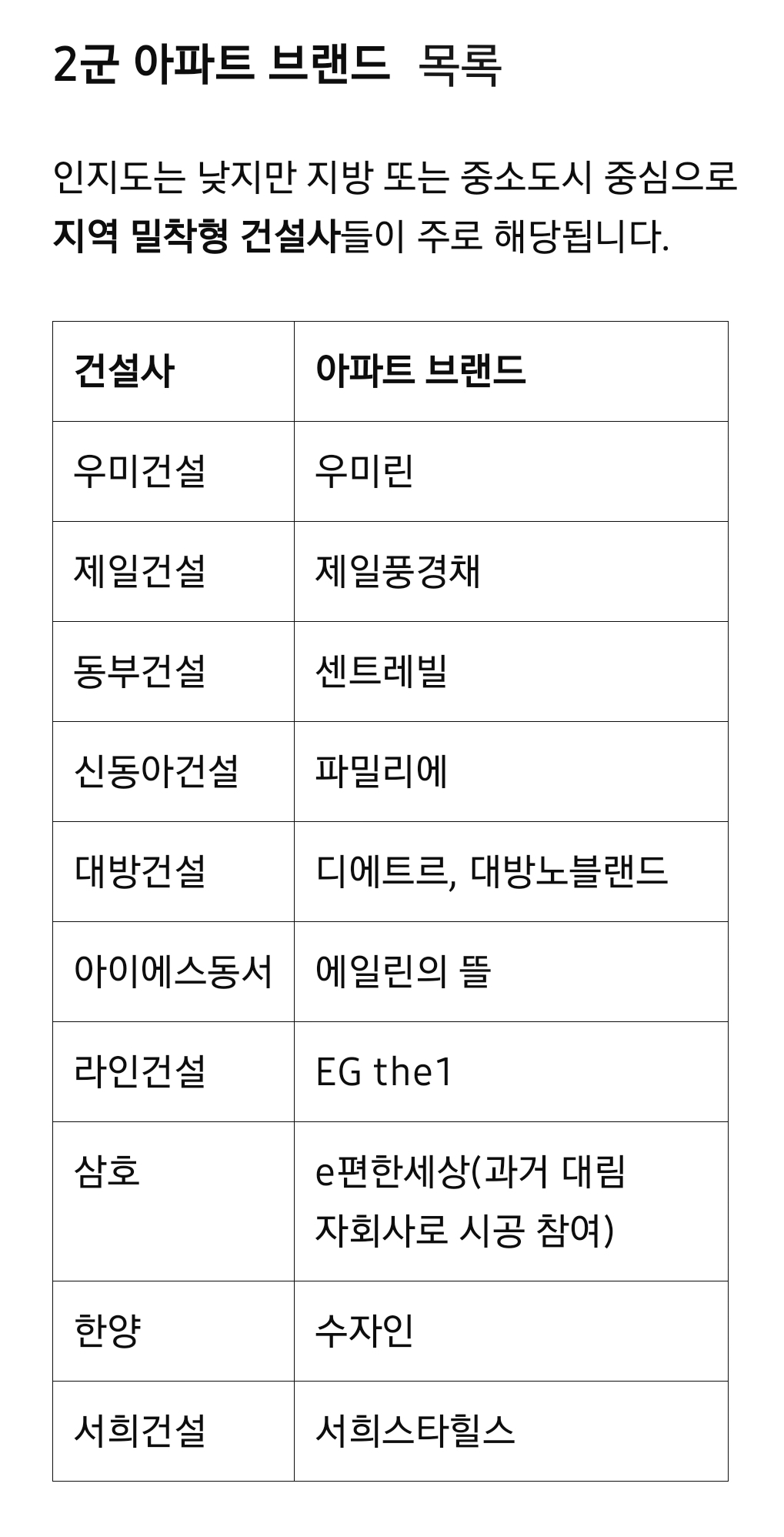 업계에서 2.5군으로 자주 분류되는 아파트 브랜드 목록입니다.