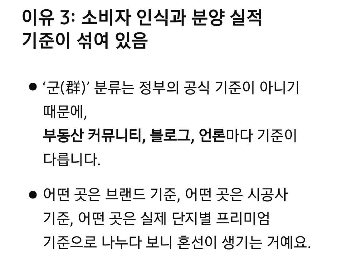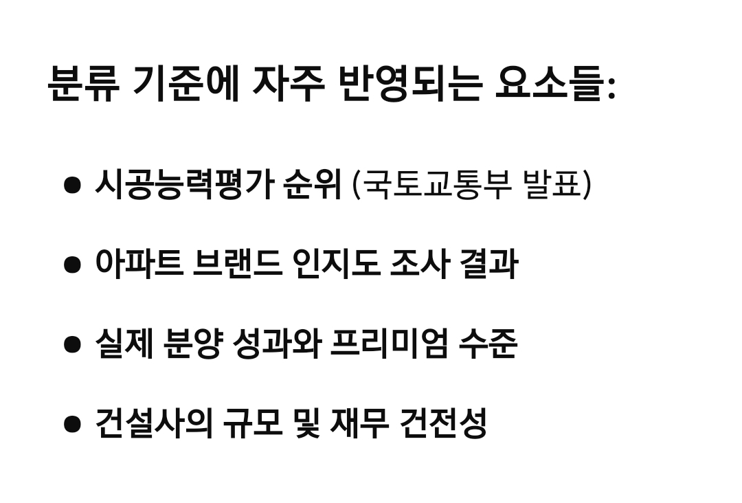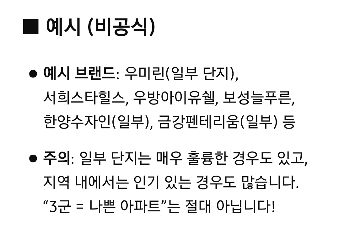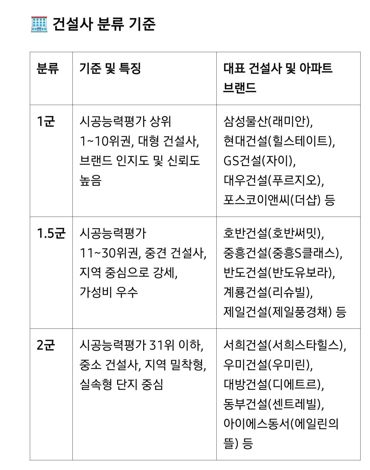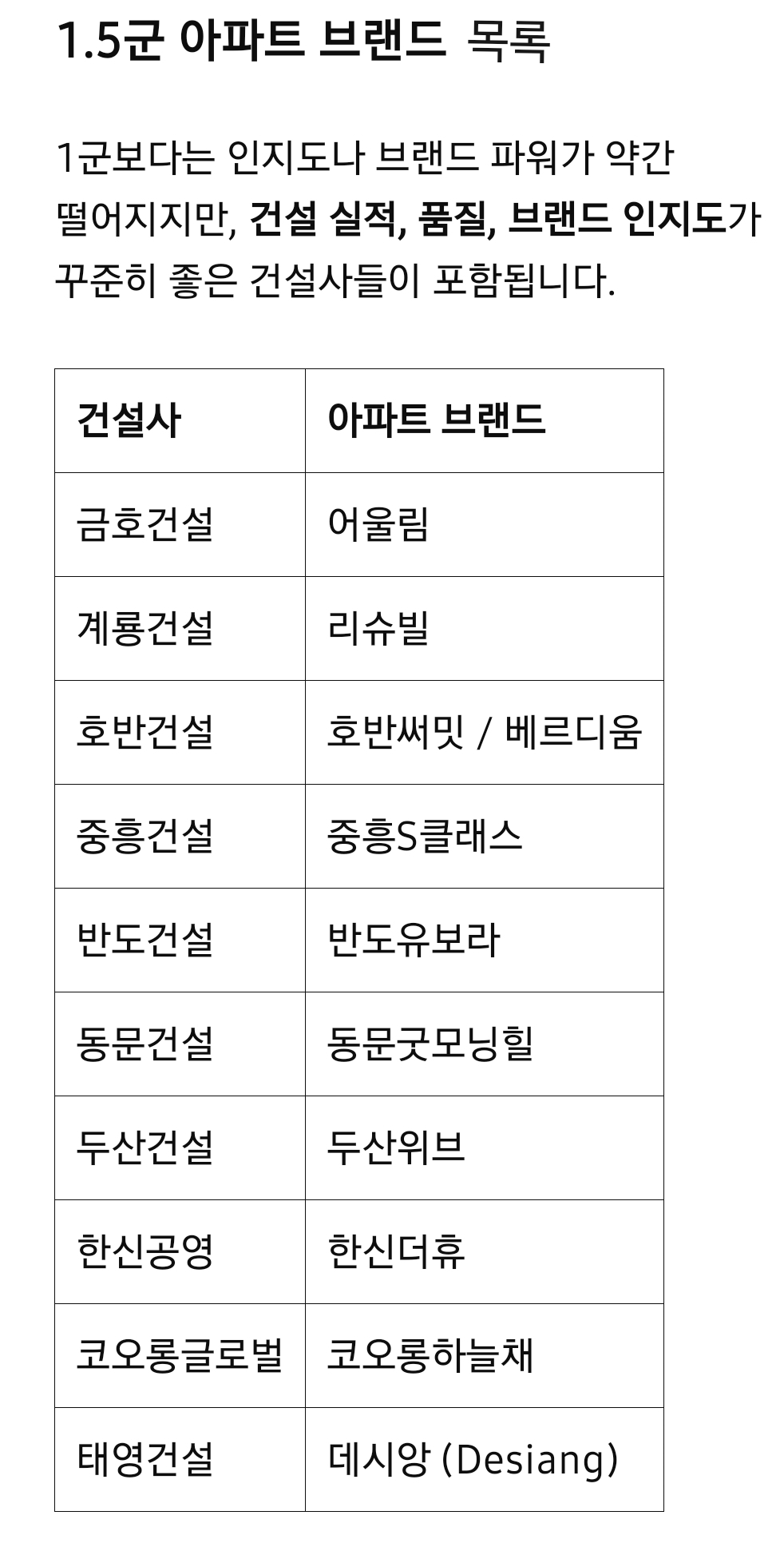 1군.1.5군과 2군 3군 아파트 브랜드를 구분해서 정리해드릴게요