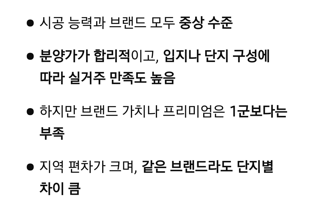 이는 인지도는 있지만 1군보다는 약하고, 3군보다는 신뢰도나 브랜드력이 더 있는 중견 건설사들입니다.