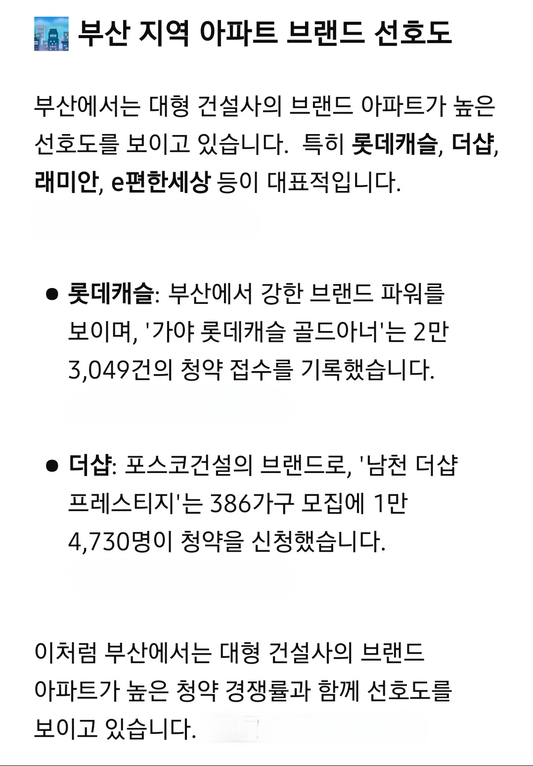한국의 아파트 브랜드 선호도는 지역별로 차이가 있으나, 전국적으로 높은 인지도를 가진 브랜드들이 있습니다. 특히 수도권과 지방 대도시에서는 브랜드 가치가 아파트 가격 형성에 큰 영향을 미치고 있습니다.