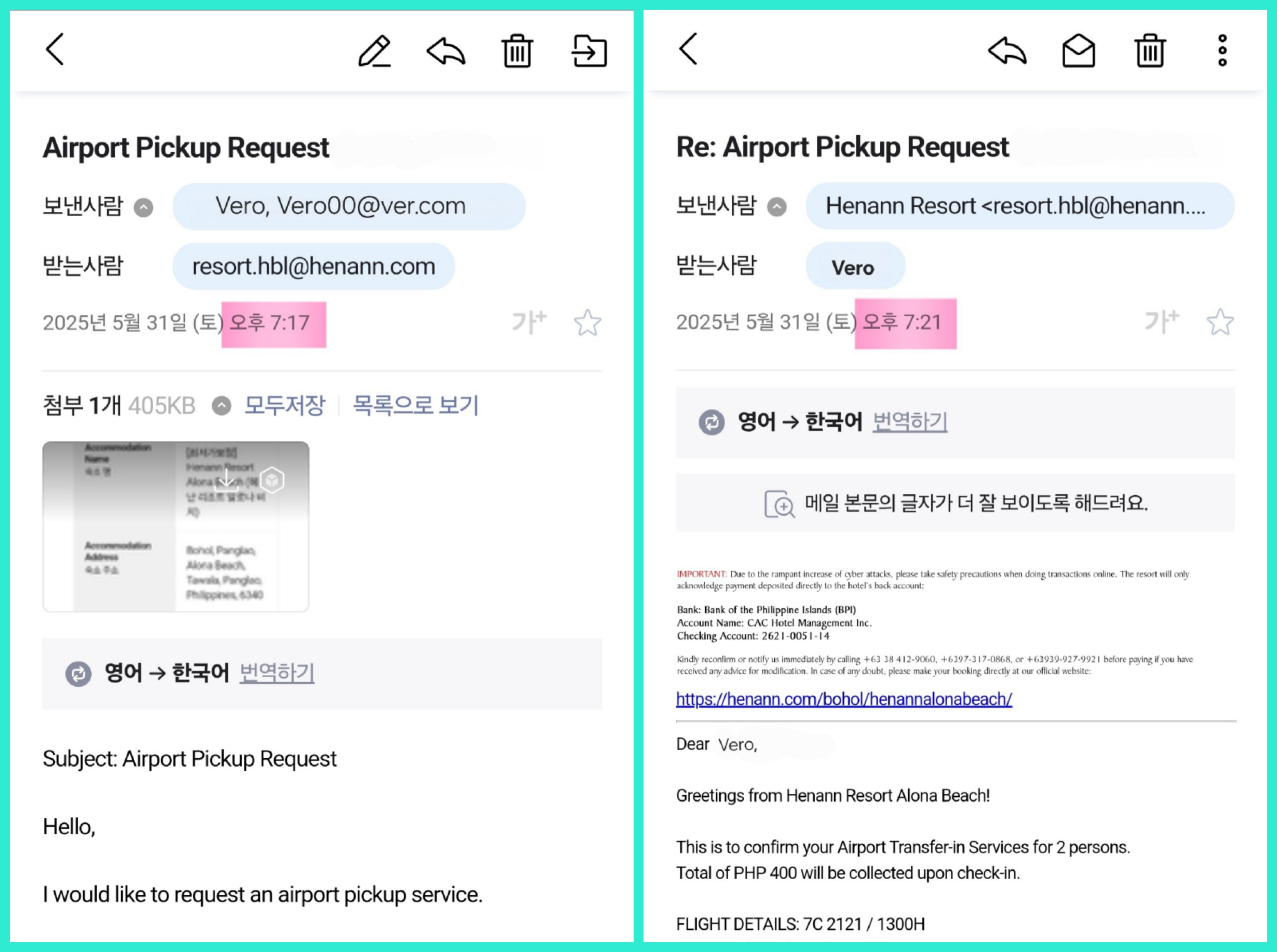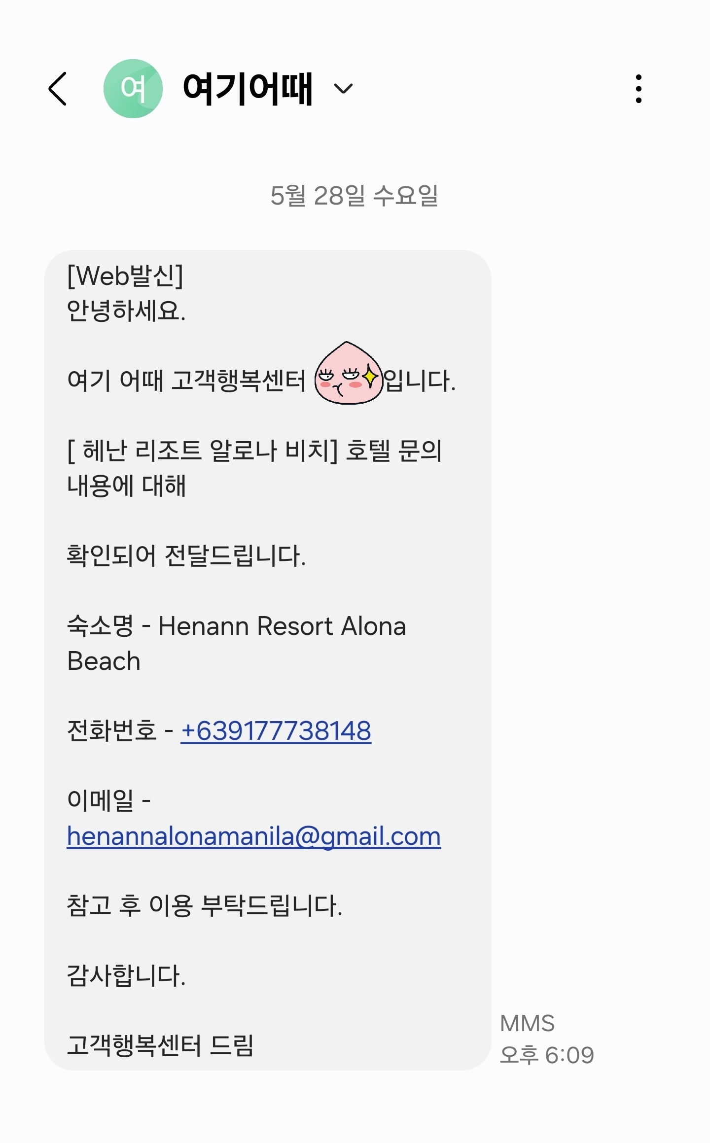 답답한 마음에 직접 검색해서 resort.hbl@henann.com 이라는 주소로 다시 보내봤더니, 놀랍게도 5분도 채 안 되어 바로 답장이 도착했어요.