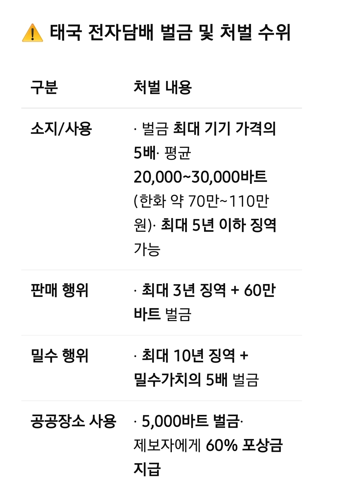 ● 일반적으로 기기 가치의 최대 5배까지 벌금을 부과할 수 있으며, 평균적으로 2만~3만 바트 (약 80만~120만 원) 수준 .