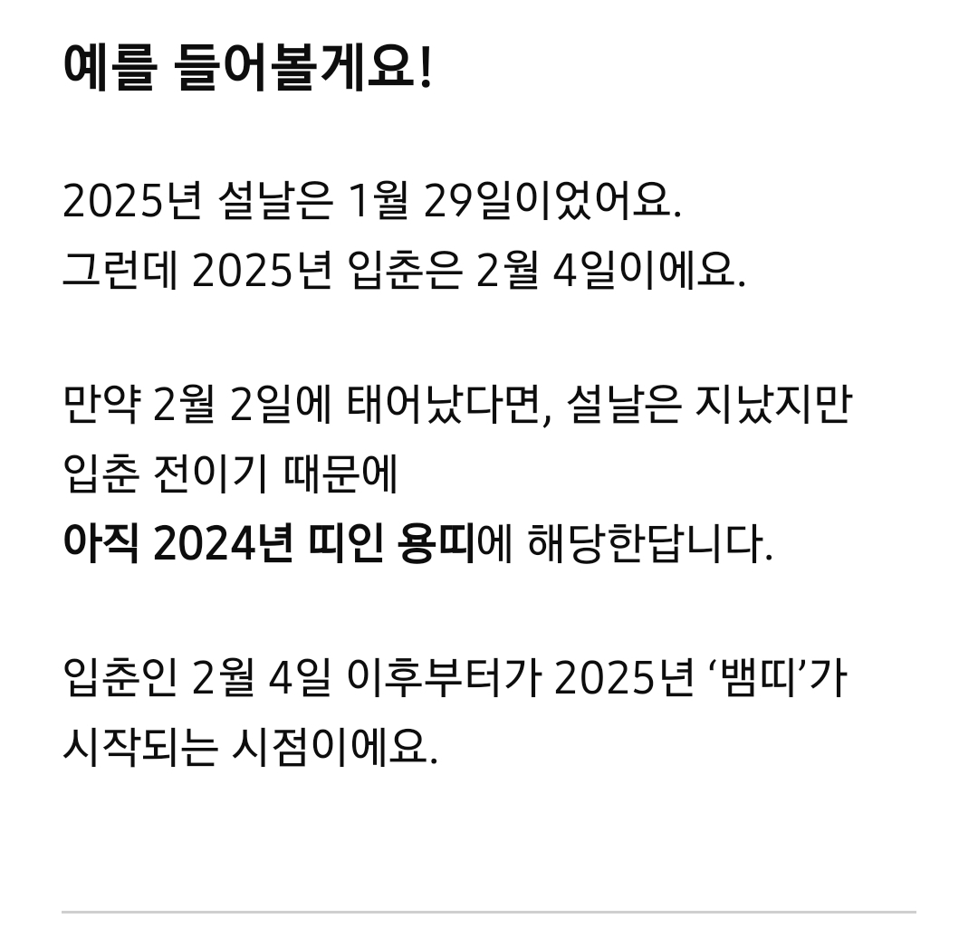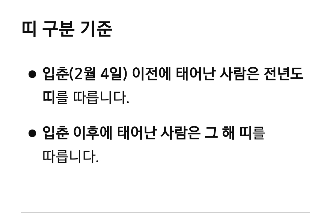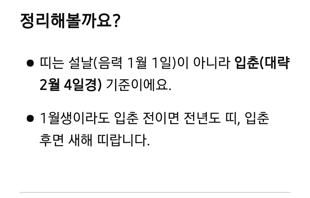 중국 음력(또는 사주)에서 띠는 보통 **입춘(立春)**을 기준으로 나누기 때문에, 입춘 이전에 태어난 사람은 전년도 띠를 따르고, 입춘 이후에 태어난 사람은 그 해의 띠를 따릅니다.